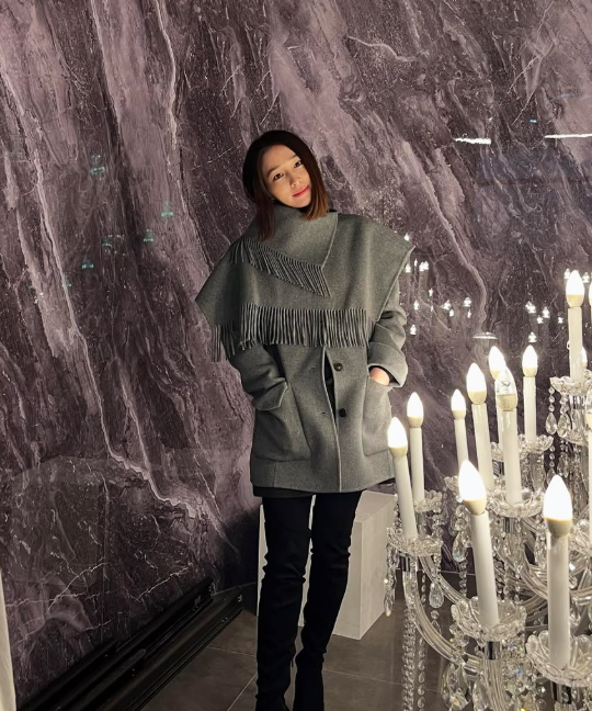 이민정이 착용한 코트는 HS 브랜드의 제품으로, 그레이 컬러에 프린지 머플러 디테일이 특징이다.