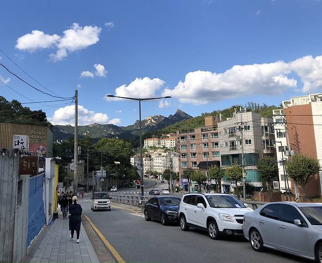 | ▲ 부암동에서 보이는 북한산의 풍경이다. 높지 않은 건물 덕분에 푸른 산과 맑은 하늘 풍경을 즐길 수 있는 동네다. |
