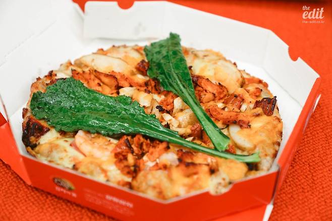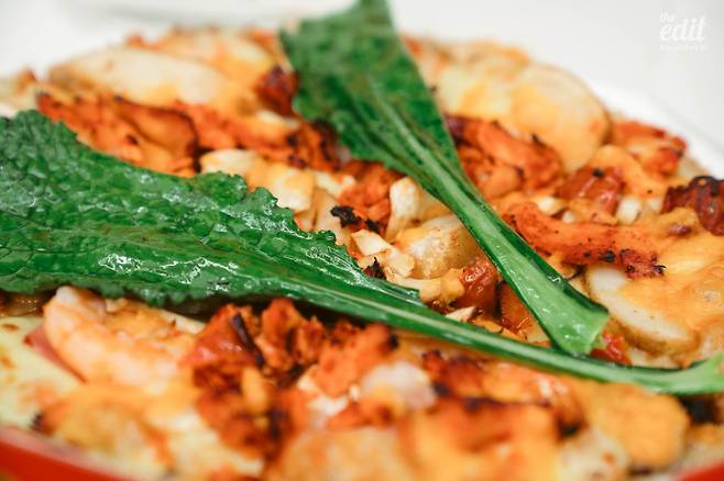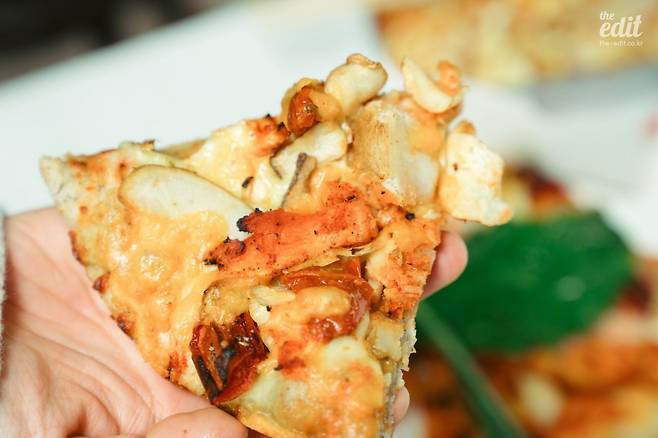 그럼에도 당황스럽다. 토핑으로 올라간 것을 읊어보겠다. ‘토스카나식 로제소스’, 선드라이드토마토, 강원도 감자, 갈릭새우, 핫 바베큐 치킨, 바질페스토와 뉴그린. 이 조합은 전형적인 K-피자가 아닌가. 이탈리안 피자를 좋아하는 사람이라면(이탈리안 피자에도 여러 종류가 있지만 가장 유명한 나폴리식 피자를 떠올리자), 이토록 많은 토핑이 올라가는 피자를 기대하지는 않았을 거다. 물론 본토 스타일과 조금은 다를 수도 있지만, 핫 치킨으로 매운 맛을 가미한다거나, 감자도 올리고, 갈릭 새우도 올리는 건 나폴리 피자의 재해석이라고 하기엔 너무 많이 다르다.
