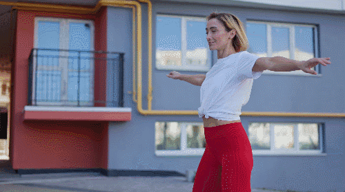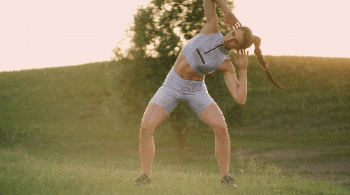 매트에 서서 다리를 넓게 벌린 뒤, 팔꿈치를 구부리고 손을 머리 옆에 둡니다. 무릎을 살짝 구부린 상태에서 상체를 오른쪽으로 숙였다가 돌아오고, 이어 왼쪽으로 숙였다가 돌아옵니다.
