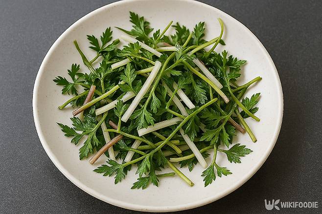 전호는 미나리과에 속한 여러해살이풀이다. 생김새는 당근이나 쑥갓 잎과 닮았고, 줄기는 연한 보랏빛을 띤다. 어린잎은 부드럽고 향이 강하며, 줄기도 함께 먹을 수 있다. 미나리처럼 생겼지만 향은 더 강하고 복합적이다. 참당귀의 쌉싸래함과 미나리의 시원함, 박하의 청량함이 함께 느껴진다. 향이 세기 때문에 호불호가 갈리기도 하지만, 식욕이 떨어질 때 먹으면 입맛을 끌어올리는 데 제격이다.