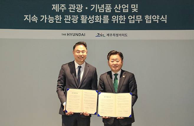 현대백화점은 28일 더현대 서울에서 제주도청과 ‘제주 관광‧기념품 산업 및 지속 가능한 관광 활성화’를 위한 업무협약을 맺었다고 밝혔다. 협약식에는 정지영 현대백화점 사장과 오영훈 제주도지사 등이 참석했다.