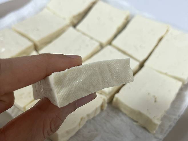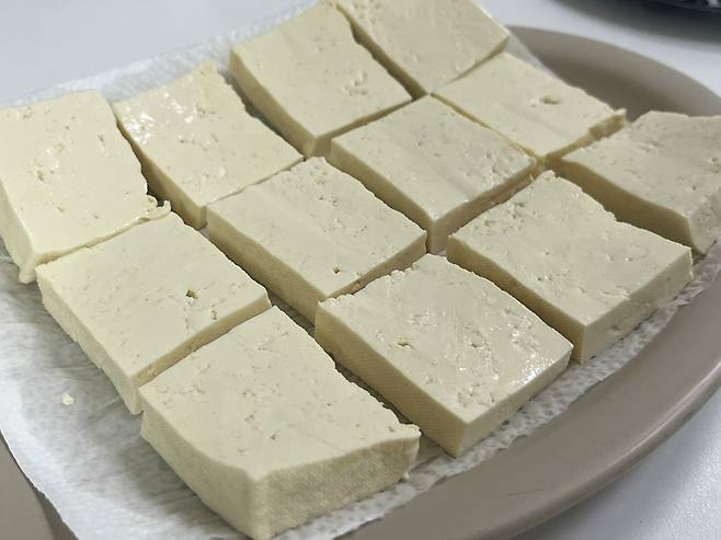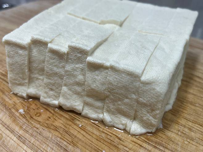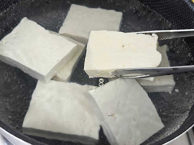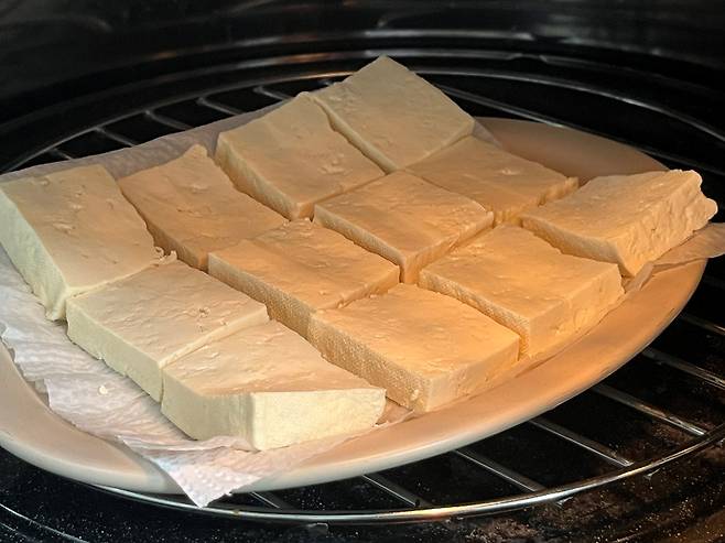 두부를 전자레인지에 넣고 약 1분 돌립니다. 이렇게 하면 두부 속의 수분이 빠져나가면서 표면이 단단해지고, 전체적으로 탱탱한 식감이 살아납니다.