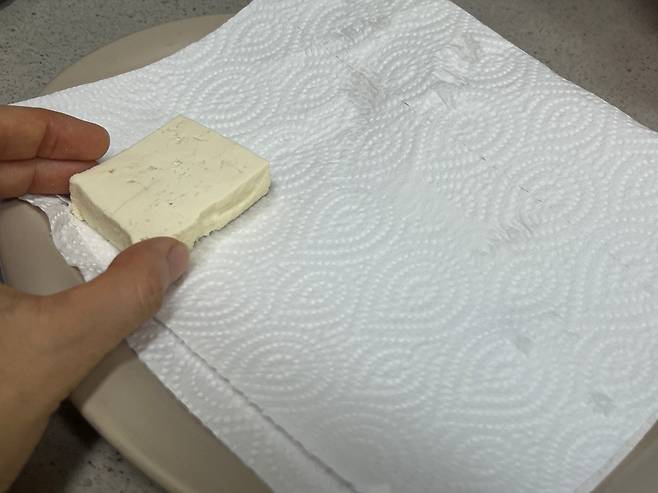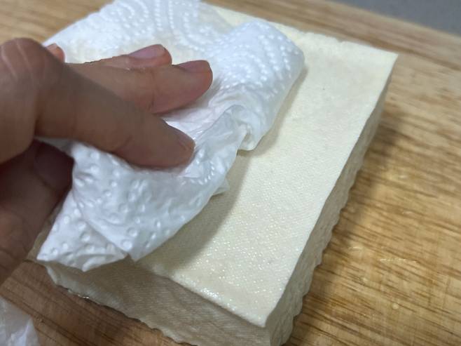 두부는 포장을 뜯어 꺼낸 다음 키친타월로 물기를 대강 제거해 주세요.