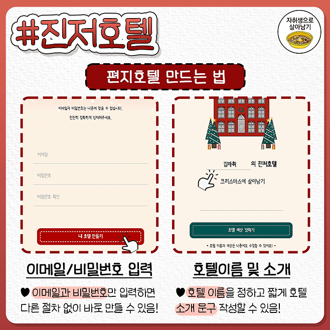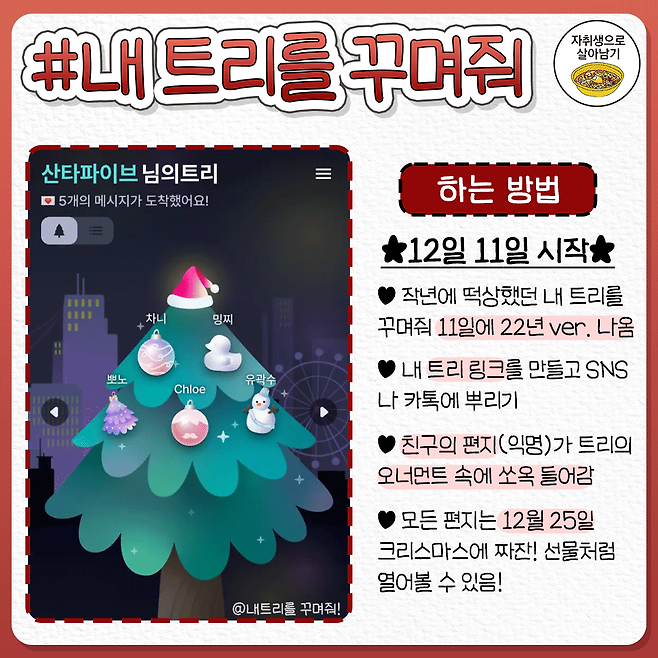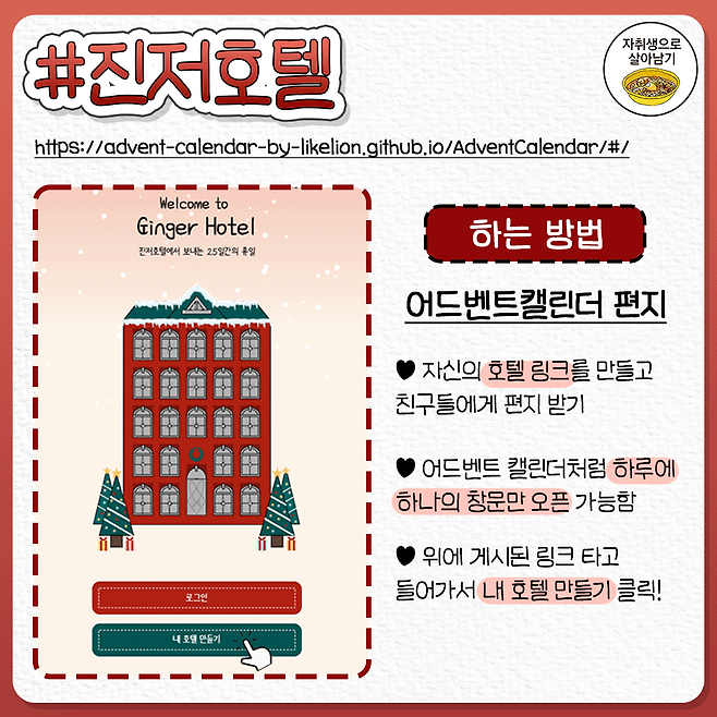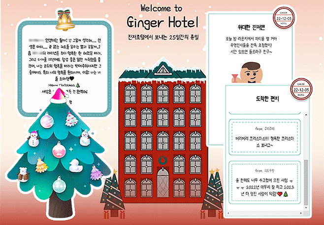 진저호텔 링크 : https://advent-calendar-by-likelion.github.io/AdventCalendar/#/내트리를꾸며줘 링크(11일 시작) : https://colormytree.me/