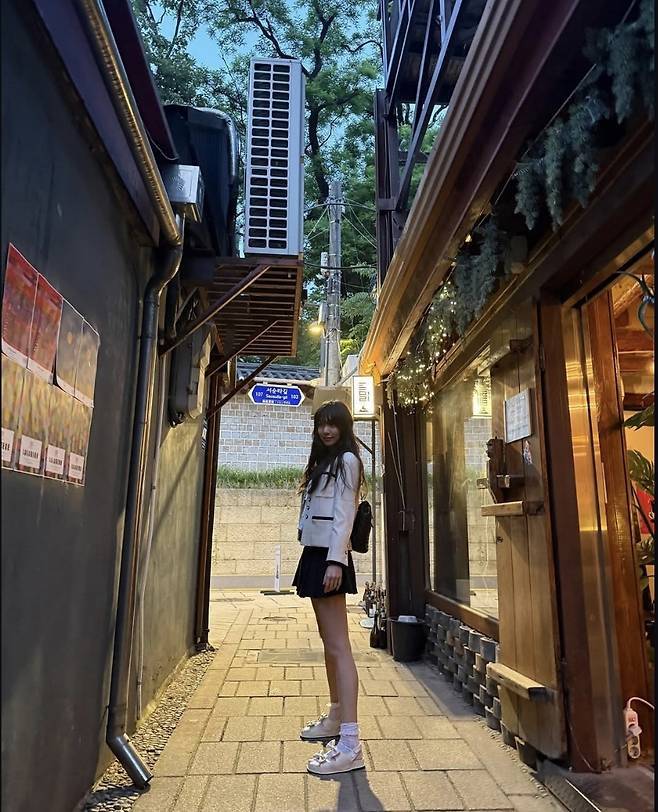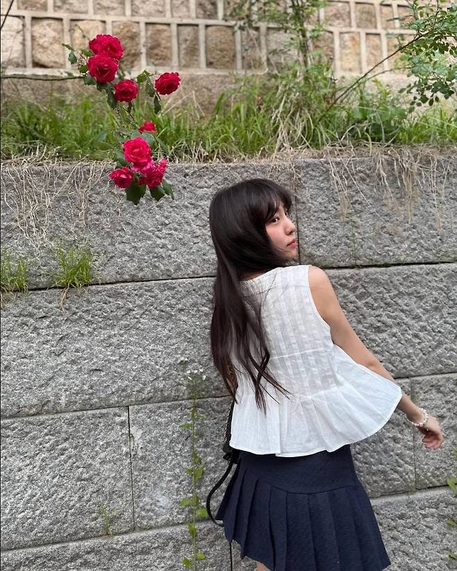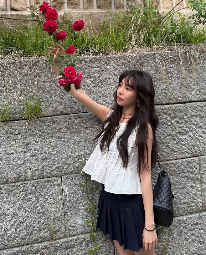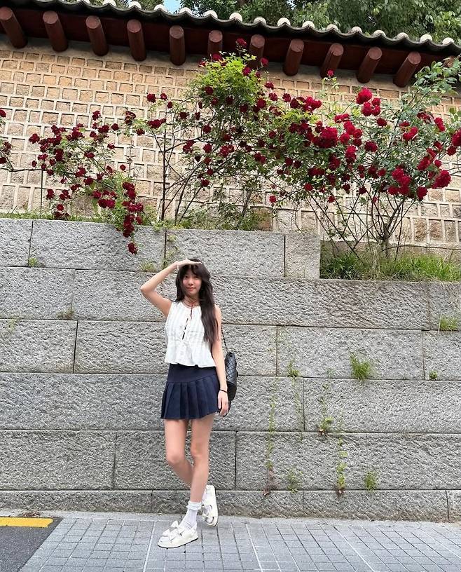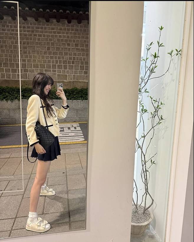 허리를 살짝 덮는 루즈핏 상의는 플리츠 미니스커트와 완벽한 균형을 이루며, 마치 캠퍼스 여신을 연상시키는 무드를 연출했습니다.