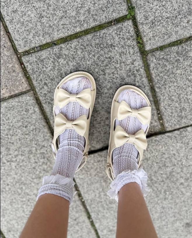 여기에 양말을 발목까지 살짝 올려 신고, 벨크로 디자인의 화이트 샌들로 발랄함을 뽐냈습니다.