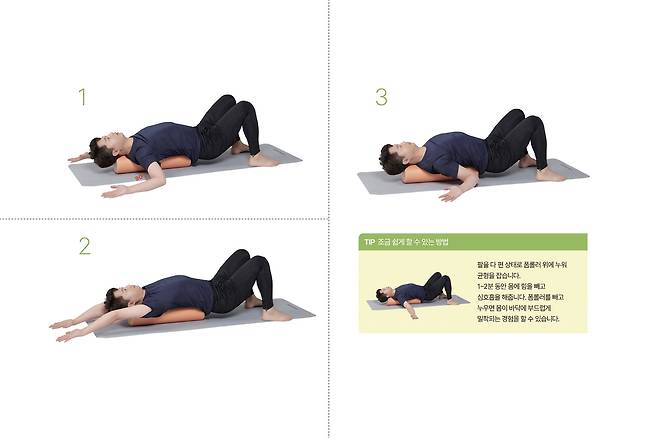 폼롤러를 세로로 놓고 위에 눕습니다. 이때 무릎을 굽혀 두 발로 균형을 잡습니다. 폼롤러는 90㎝짜리로 머리부터 엉덩이까지 지지해줄 수 있는 게 좋습니다. 양팔을 옆으로 벌린 채 팔꿈치는 90도로 굽히고 손바닥이 천장을 향하게 한 뒤 바닥에 내려놓습니다. 이 자세를 취하는 것만으로도 등이 펴지고 대흉근이 당겨오기 시작할 겁니다.