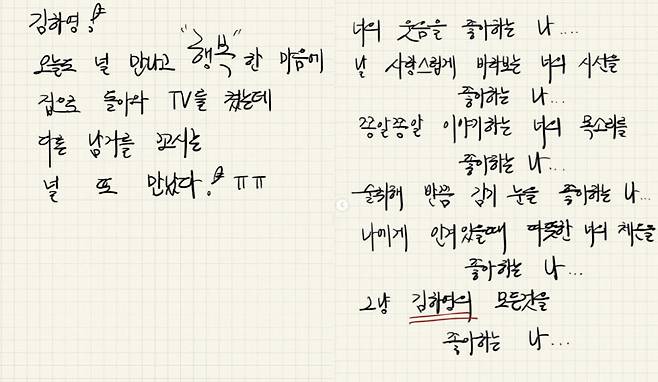김하영은 SNS에 “요즘은 이런 이벤트도 안 한다, 변했다 박상준ㅋㅋ”라는 글과 함께 과거 연애 편지를 공개했습니다. 편지 속 박상준은 “김하영의 웃음, 시선, 목소리, 체온까지 다 좋다”며 그녀에 대한 애정을 숨김없이 드러냈습니다.