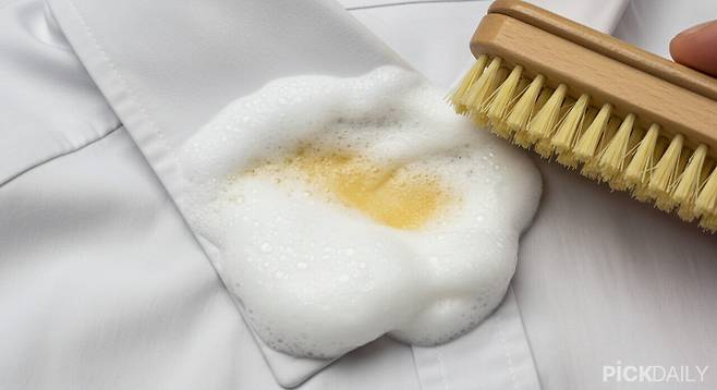이후 칫솔이나 부드러운 솔로 가볍게 문질러주면 된다. 너무 세게 문지르면 섬유가 상할 수 있으니 반복적으로 톡톡 두드리듯 닦아내는 게 좋다. 이렇게 10분 정도 기다려준 뒤 미온수로 헹궈주면 대체로 얼룩이 눈에 띄게 옅어지거나 완전히 사라진다.