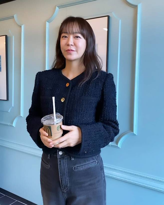 블랙 트위드 재킷에 데님을 매치한 첫 장면은 담백하면서도 정제된 분위기를 보여주고, 카페 한켠에서 아이스 아메리카노를 들고 있는 모습이 자연스럽게 어우러져 있었어요.