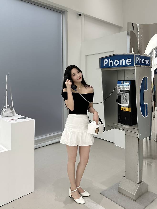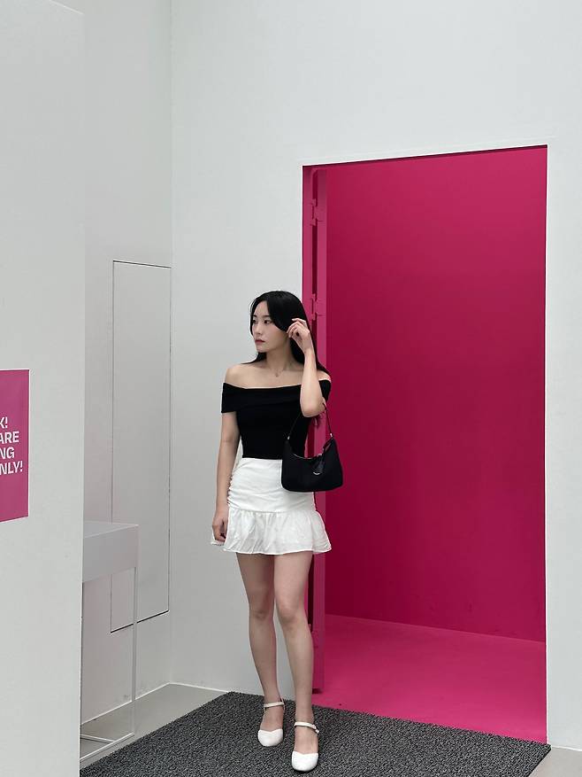 블랙 오프숄더 상의에 화이트 미니스커트를 매치하면,