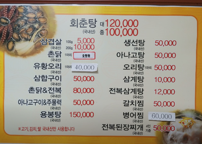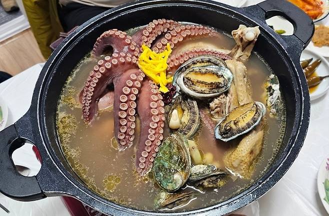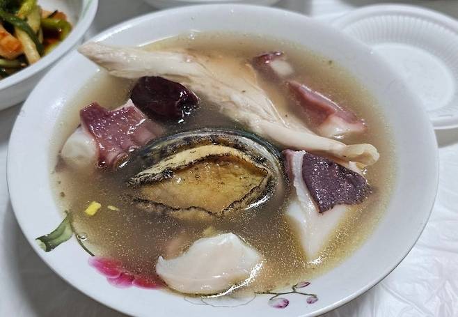 회춘탕. 댥과 전복, 문어가 메인으로 들어갔다. 근데 이거 우리 동네 해신탕인데.. 국물은 12가지 한약재를 사용해서 우려내였고, 뭉근하게 끓여 해산물 고유의 짠맛이 우러나오도록 했기 때문에 소금을 하나도 사용하지 않았다고 한다.