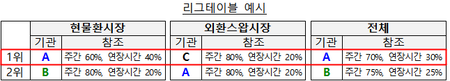 우선 외환거래 시간이 연장된 지 1년이 되는 오는 7월부터 외운협을 통해 RFI를 포함한 모든 외환시장 참가기관을 대상으로 ▲현물환시장 ▲외환스왑시장 ▲전체(현물환+외환스왑시장) 등 항목별로 거래량 상위 7개 기관을 발표합니다.