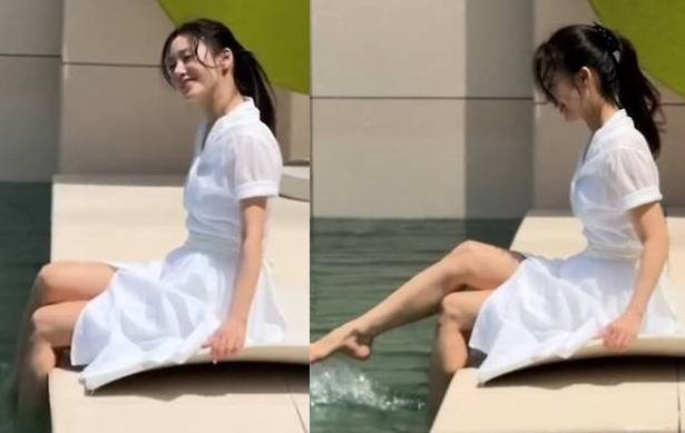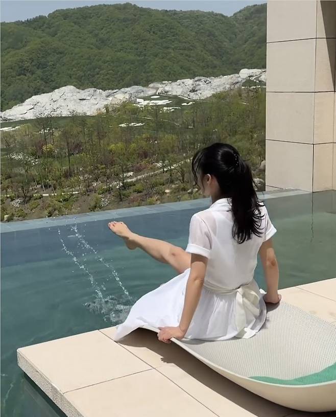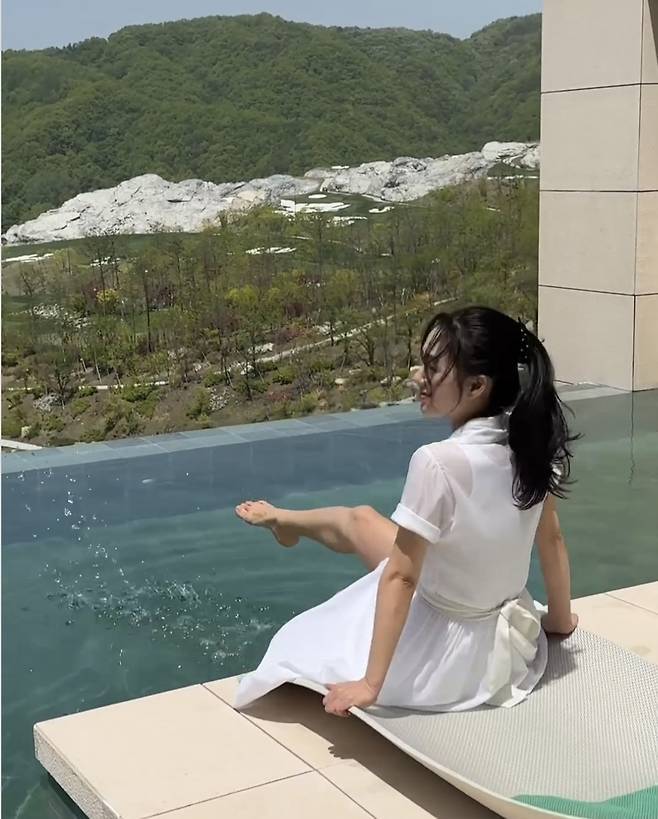 물가에 앉아 자연스럽게 발을 담그며 보여준 자유롭고 여유로운 모습은 마치 한 폭의 화보 같았습니다.