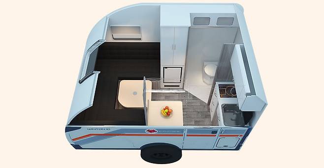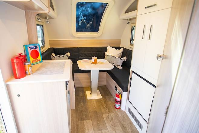 주방 옆에는 샤워실, 세면대, 화장실이 포함된 욕실이 있어 기본적인 위생 시설을 모두 갖췄다. 실내 중심부에는 최대 4~5명이 앉을 수 있는 다이닝 공간이 마련돼 있으며, 이 공간은 침대로 변환 가능하다.