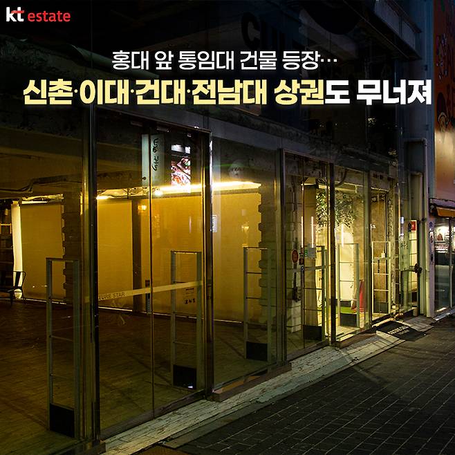 한국일보가 지난 3월 보도한 기사에 따르면, 이대역부터 대학 정문까지 이어지는 ‘이화여대길’에는 1층 상가 11곳이 공실 상태였습니다. 신촌역과 연세대를 이은 ‘연세로’ 건물 중에도 ‘임대’ 표시가 늘고 있다고 하고요. 심지어 4층 건물 전면에 ‘전층 임대’ 현수막까지 걸려있다고 하니 젊은이들이 북적였던 예전 모습은 찾기 힘든 상황입니다.