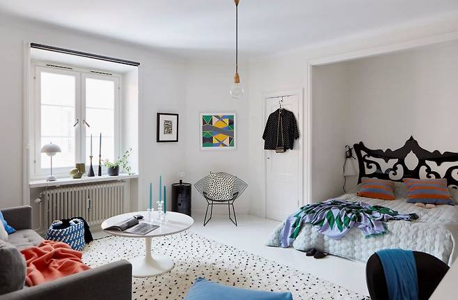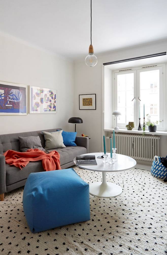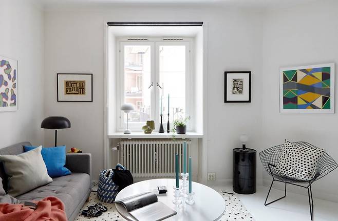 전체적으로 화이트톤을 유지한 이 집은 쿠션, 포스터, 조명 등 비비드 컬러 소품을 활용해 활력을 더했다. 특히 봄과 여름에는 파란색이나 노란색 같은 선명한 색상을 활용하면 계절감을 살릴 수 있다. 교체가 쉬운 소품이야말로 작은 집 인테리어의 핵심이다.