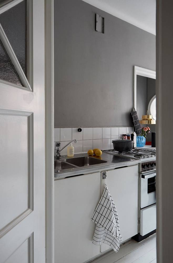주방의 오래된 싱크대는 화이트 페인트로 새롭게 재탄생했다. 문을 분리해 따로 칠하는 방식으로 깔끔함을 극대화했고, 선반 부분은 일부 포인트로 남겨 감각적인 분위기를 냈다. 리모델링이 부담스럽다면 페인트만으로도 충분한 효과를 볼 수 있다.