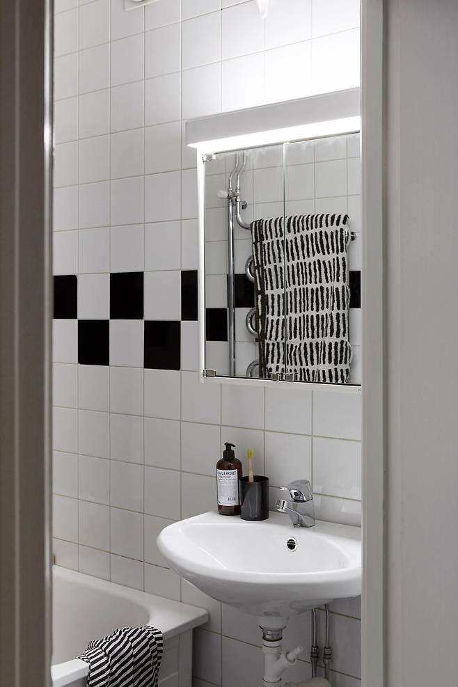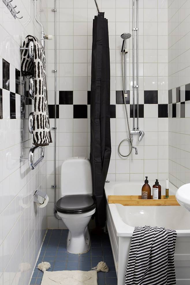 블랙과 화이트를 테마로 한 욕실은 수건, 샤워커튼, 변기 커버까지 모두 톤을 맞춰 세련된 분위기를 냈다. 바닥 타일이 아쉬울 땐 발 매트로 포인트를 주는 것도 좋은 팁이다. 작은 욕실도 정돈된 색 구성만으로 분위기를 크게 바꿀 수 있다.