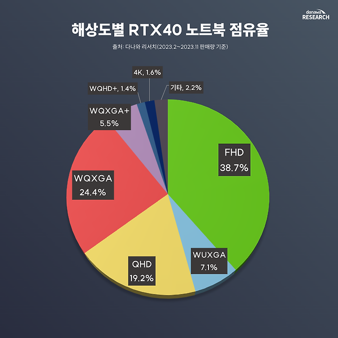 하지만 해상도군 단위로 하면 QHD 해상도군(QHD, WQXGA, WQXGA+, WQHD+)도 50.5%로 만만치 않다. 고사양 주력 게이밍 노트북들이 주로 QHD 해상도군에 속한다. 4K 해상도는 1.6%에 불과했다.