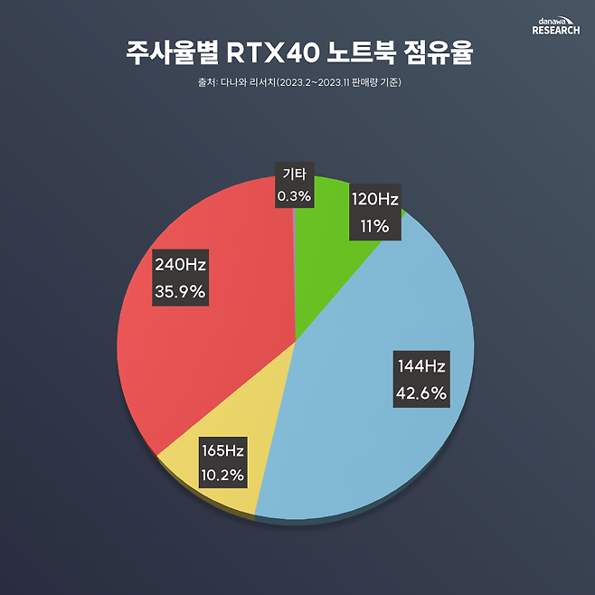 고사양 노트북, 특히 게이밍 노트북은 고주사율이 필수적이다. 현재 이 시장은 144Hz와 240Hz가 양분하고 있는 실정이다. 그중에서 점유율이 더 높은 것은 144Hz이며 42.6%를 기록했다. 최근 고성능 게이밍 노트북의 트렌드로 떠오른 240Hz 주사율은 35.9%로 점유율이 점점 더 늘어나는 추세다. 그밖에 120Hz(11.0%), 165Hz(10.2%)가 틈새시장을 공략하고 있다.