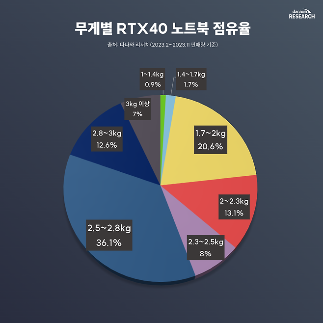 가장 점유율이 높았던 구간은 2.5~2.8kg이며 전체의 36.1%였다. 전력 효율이 우수한 RTX 40 칩셋 덕분에 경량 게이밍 노트북들이 속속 나오고 있지만, 아직 게이밍 노트북 구매자들은 경량보다는 냉각 효율과 성능을 극대화한 중량급 제품을 선호하고 있는 것으로 보인다.
