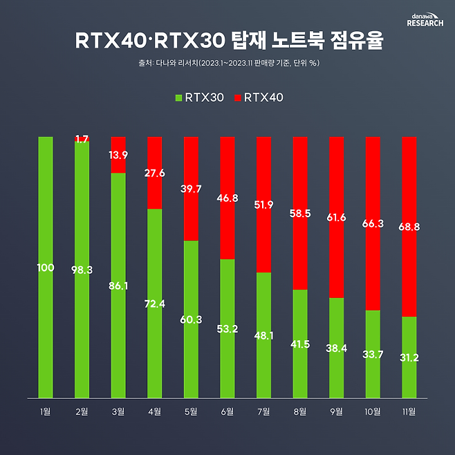 RTX 40 시리즈를 탑재한 노트북의 인기는 판매량 점유율 그래프를 통해 확인 가능하다. 올해 2월 1.7%에서 출발한 RTX 40 노트북의 점유율은 3월부터 급격히 상승하여 7월을 기점으로 이전 세대인 RTX 30 노트북의 점유율을 따라잡았고, 이후 한 번의 역전도 허용하지 않으며 격차를 점점 더 벌리고 있다.
