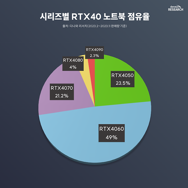 RTX 40 노트북이 출시한 올해 2월부터 11월까지 RTX 40 시리즈 노트북 그래픽 칩셋별 판매 점유율을 분석한 결과다. 1위는 RTX 4060(49%)으로, 거의 과반에 가까운 압도적인 점유율이다. 실제로 소비자들이 주로 구매하는 메인스트림 게이밍 노트북 대부분이 RTX 4060을 탑재하고 있다. 해당 그래픽카드를 탑재한 노트북은 FHD 해상도로 게임할 때 풀옵션, 고주사율을 모두 어느 정도 만족할 수 있어서 가성비의 꿀단지로 여겨진다.
