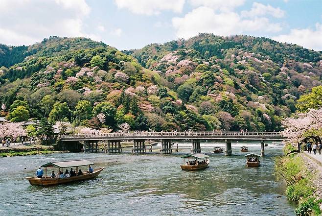 교토 서쪽에 위치한 아라시야마는 봄의 대자연을 입체적으로 즐길 수 있는 곳입니다. 도게츠교 너머로 보이는 산등성이가 벚꽃으로 수놓아진 모습은 마치 한 폭의 수채화를 보는 듯한 감동을 줍니다.