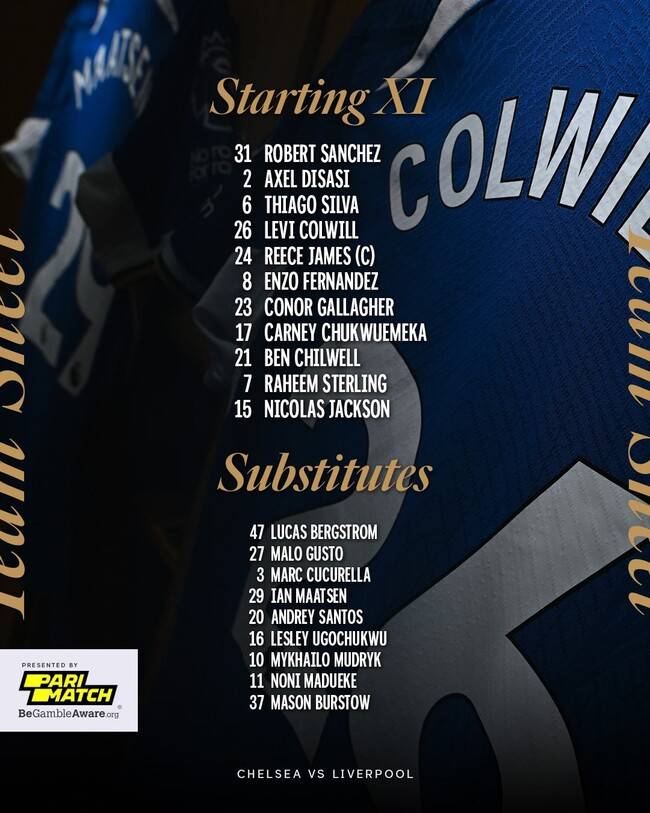 홈팀 첼시는 잭슨, 스털링, 칠웰, 추크에메카, 갤러거, 제임스, 페르난데스, 콜윌, 실바, 디사이, 산체스가 선발로 투입된다.