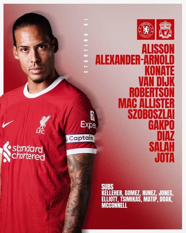 원정팀 리버풀은 살라를 비롯해 조타, 디아스, 각포, 소보슬라이, 맥 알리스터, 로버트슨, 반 다이크, 코나테, 알렉산더-아놀드, 알리송이 선발로 나선다.