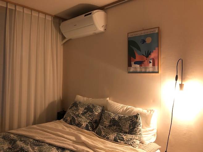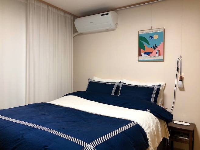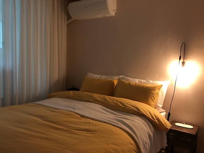 저희 집에서 가장 심플한 공간인 안방입니다! 침대, 사이드 테이블, 붙박이장으로 끝나는 공간이죠. 사이드 테이블은 가격 대비 마음에 드는 것이 없어 이케아에서 가장 저렴한 사각 스툴을 우드 스테인으로 리폼하여 취향에 맞게 탈바꿈하였습니다! 삼나무 목판을 사이에 추가하여 에어컨 리모컨, 책등 간단한 수납도 가능하고요!