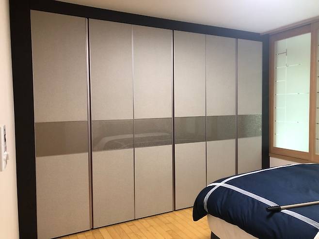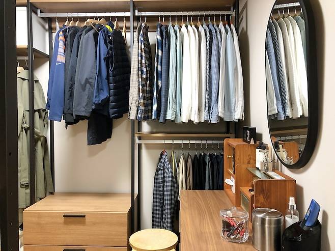 화장실 옆 가장 작은 방에 꾸민 드레스룸이에요. 평소 각 잡아 정리하는 것을 매우 즐겨 항상 이 상태를 유지하고 있습니다. 그래서인지 놀러 오는 손님마다 드레스룸 상태를 보고 신기해하곤 해요. (남편 아우터 옷걸이에 삐져나온 옷걸이, 셔츠 간격이 상당히 신경 쓰이네요...)