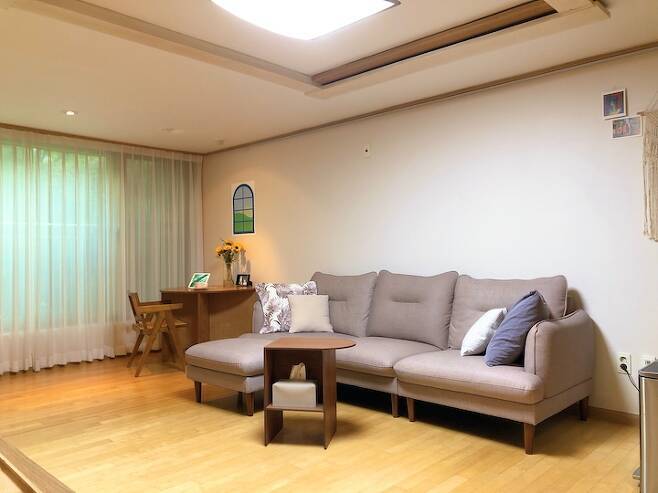 집을 보러 다닐 때 좁은 거실에 체리색 파티인 집들을 보며 이사하지 말까? 하는 생각이 들 정도로 맘에 드는 집이 없었어요. 그러다 하나만 더 보고 결정하자며 이 집을 보았는데 현관문을 열자마자 딱 느낌이 왔습니다.