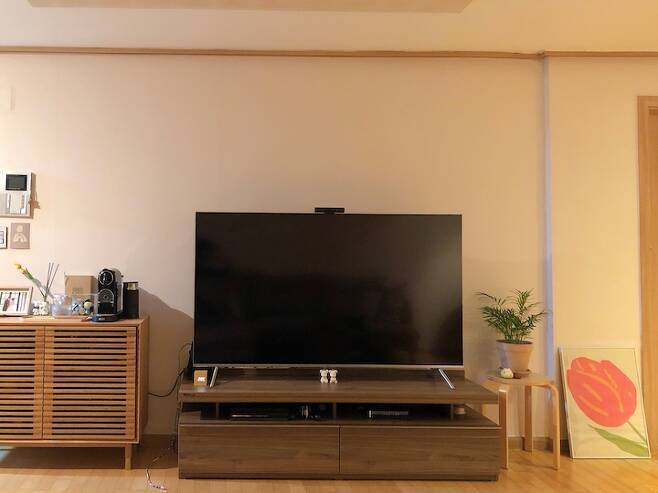 소파는 이사 오면서 가운데 모듈을 추가하여 더 넓게 쓰고 있어요! 이노패브릭이라는 패브릭 느낌만 낸 소재라 관리가 편하고 착석감도 좋아 급하게 샀지만 매우 흡족한 혼수 중 하나예요 : ) 아쉬운 아이템이라 하면 거실장...? 지금 집에 조화롭지 못한 모던한 디자인과 우드톤...ㅜㅜ 마음 같아선 TV 스탠드로 바꾸고 싶답니다.