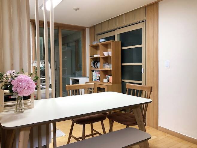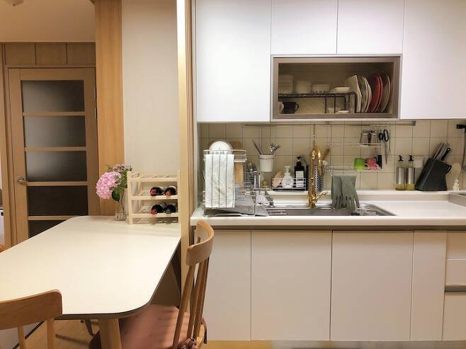 주방이 좁은 경우 식탁을 거실로 배치하는 경우를 많이 보았으나 저희는 꼭 주방에 식탁이 있어야 한다는 고집이 있었습니다. 4~6인용 테이블을 놓을 자리가 있어 얼마나 다행이던지요...!! 거실 테이블에서도 식사를 하지만 편리하게 준비하고 치우는 건 주방 식탁이 최고입니다 : )