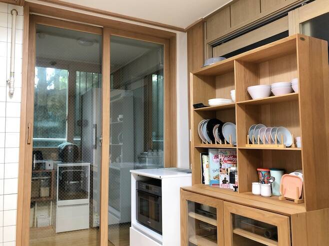 주방 가구, 가전 배치에 가장 골칫덩어리는 바로 냉장고죠?! 다행히 주방 베란다가 매우 넓어 냉장고, 김치냉장고, 소형가전을 모두 정리할 수 있었습니다!