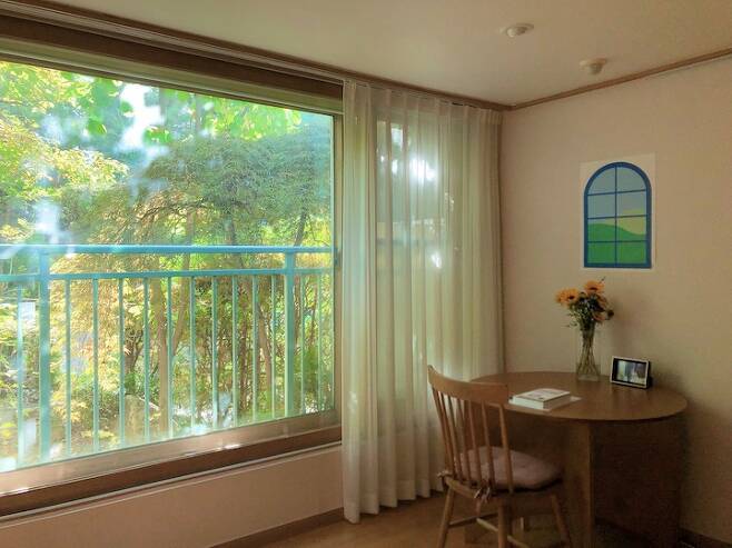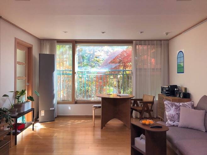 거실에서는 사계절의 변화를 느낄 수 있는 큰 나무가 보여요. 덕분에 올해 코로나 시즌의 벚꽃은 집에서 즐길 수 있었어요! 요즘은 초록빛에서 단풍이 들어 또 다른 매력을 뽐내고 있답니다.
