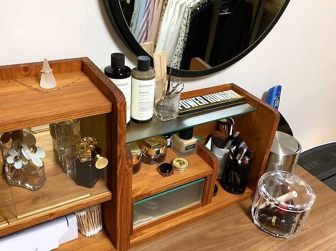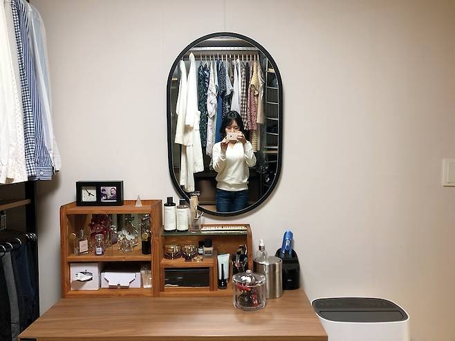출근 동선을 고려하여 화장대도 드레스룸에 꾸몄어요! 이사 오면서 화장대를 구입하였지만 운명이 아니었는지 반복되는 불량 제품 수령으로 결국 지금의 소가구로 정착하게 되었습니다. 인스타그램에서 발견한 브랜드인데 투박한 듯 원목의 따뜻함이 매력적이라 매우 만족하는 제품이에요!