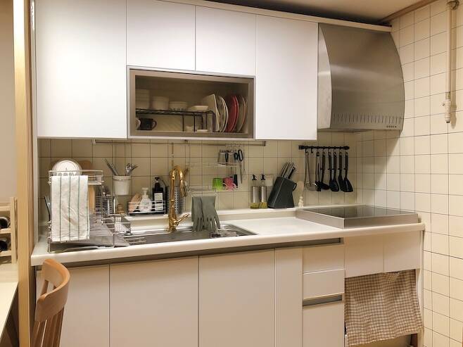좁은 주방의 수납을 위해 싱크대 내부 정리에도 잔머리를 많이 썼지만 턱없이 부족하긴 했어요. 수납공간도 확보할 겸 키가 작아 상부장을 적극 활용하지 못하는 저를 위해 그릇장을 두었답니다.