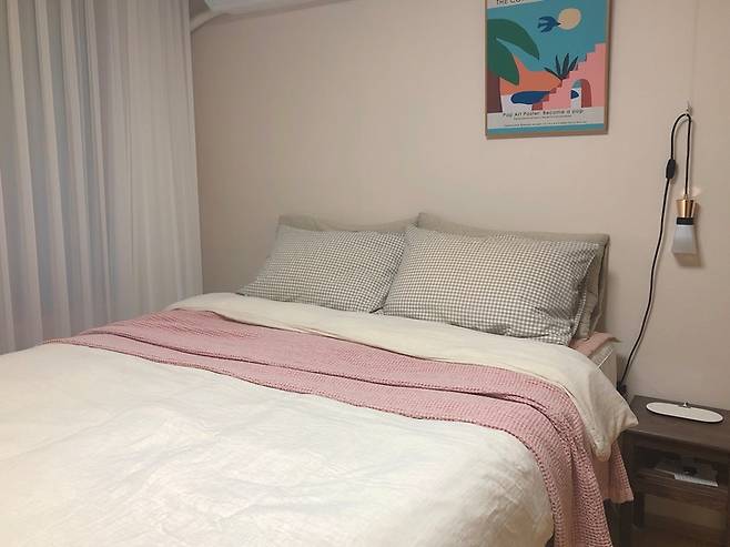 침실은 침구를 통해 분위기를 자주 바꾸는 편이에요 : )