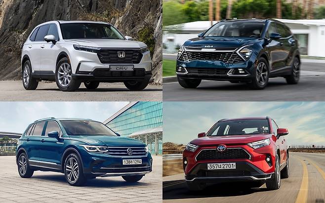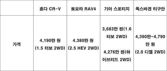 정리하면, 혼다 CR-V는 유일하게 4.7m 넘는 차체와 1.5L 가솔린 터보 엔진의 저렴한 자동차세 및 3종 저공해차 혜택, 넉넉한 트렁크 공간을 앞세웠다. 기아 스포티지는 동급에서 가장 넓은 휠베이스와 CR-V보다 높은 토크 및 복합연비를 갖췄다. 가솔린과 하이브리드, 디젤과 LPG 등 다양한 파워트레인 구성도 장점이다. 토요타 RAV4는 북미 승용차 판매 1위라는 타이틀, 그리고 검증 받은 하이브리드 구동계를 앞세워 뛰어난 경제성을 어필한다. 폭스바겐 티구안은 넷 중 가장 작은 체격과 디젤 엔진을 갖췄지만, 크기가 한층 넉넉하고 2.0L 가솔린 터보 엔진 갖춘 올스페이스 모델을 별도로 마련해 소비자 선택 폭을 넓혔다.