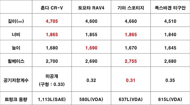 먼저 체격 비교부터. 이번 CR-V의 차체는 기존보다 75㎜ 더 길다. 이젠 C-세그먼트가 아닌 D-세그먼트 중형 SUV로 불러도 손색없다. 차체 너비는 CR-V와 스포티지가 1,865㎜로 가장 넓은 가운데 티구안이 1,840㎜로 가장 작다. 반면, 차체 높이는 RAV4가 1,690㎜로 가장 높고 CR-V가 1,680㎜, 스포티지가 1,670㎜, 티구안이 1,645㎜다. 확실히 CR-V의 커다란 차체가 돋보인다.