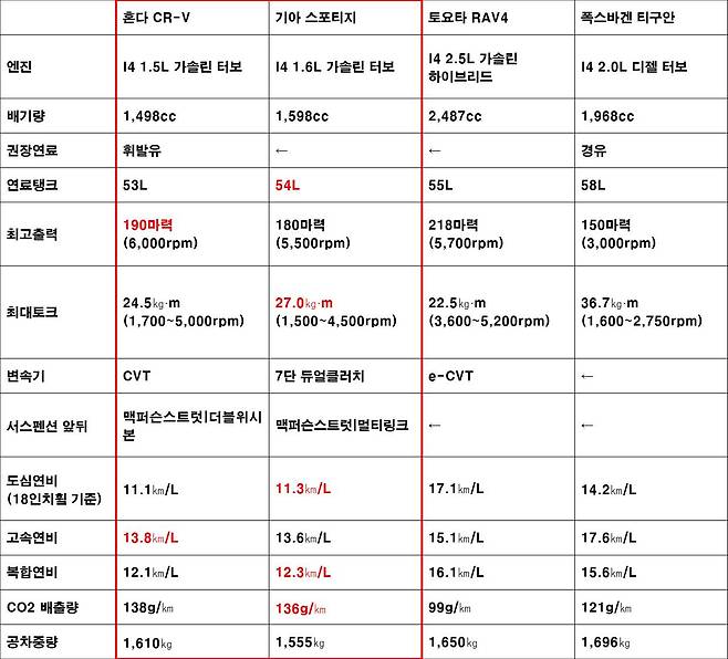 정리하면, 혼다 CR-V는 유일하게 4.7m 넘는 차체와 1.5L 가솔린 터보 엔진의 저렴한 자동차세 및 3종 저공해차 혜택, 넉넉한 트렁크 공간을 앞세웠다. 기아 스포티지는 동급에서 가장 넓은 휠베이스와 CR-V보다 높은 토크 및 복합연비를 갖췄다. 가솔린과 하이브리드, 디젤과 LPG 등 다양한 파워트레인 구성도 장점이다. 토요타 RAV4는 북미 승용차 판매 1위라는 타이틀, 그리고 검증 받은 하이브리드 구동계를 앞세워 뛰어난 경제성을 어필한다. 폭스바겐 티구안은 넷 중 가장 작은 체격과 디젤 엔진을 갖췄지만, 크기가 한층 넉넉하고 2.0L 가솔린 터보 엔진 갖춘 올스페이스 모델을 별도로 마련해 소비자 선택 폭을 넓혔다.