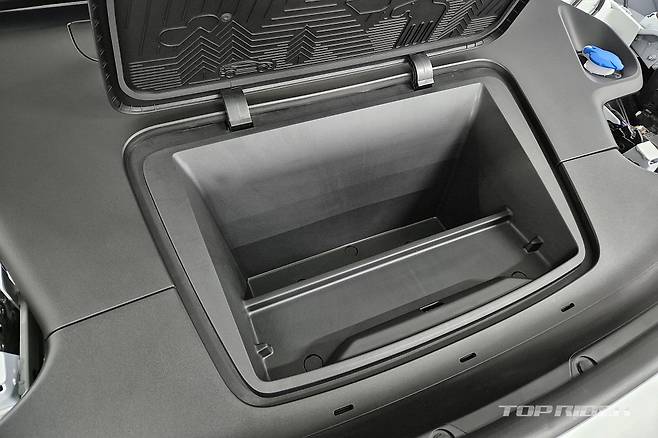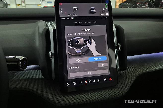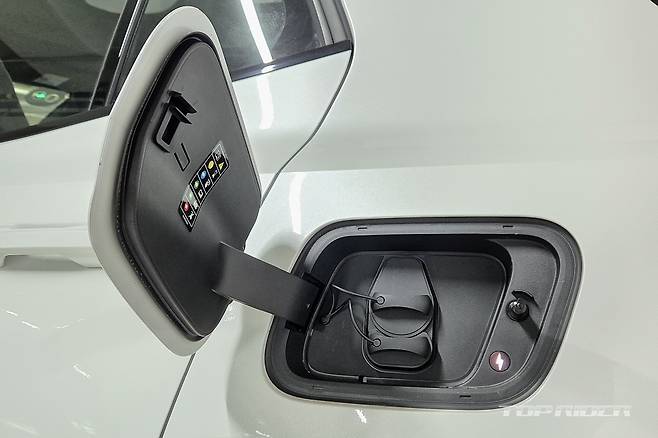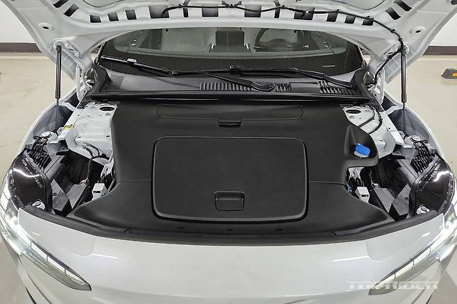 측면에서는 뒤로 갈수록 낮아지는 공기역학을 고려한 루프 실루엣을 블랙컬러 마감으로 숨겼다. 배터리팩 수용으로 넓어진 측면 면적은 하단을 블랙 마감해 둔한 모습을 줄였다. 통으로 조절되는 프레임리스 사이드미러는 폴스타의 그것과 유사하다. 충전구는 전통적인 주유구 위치다.