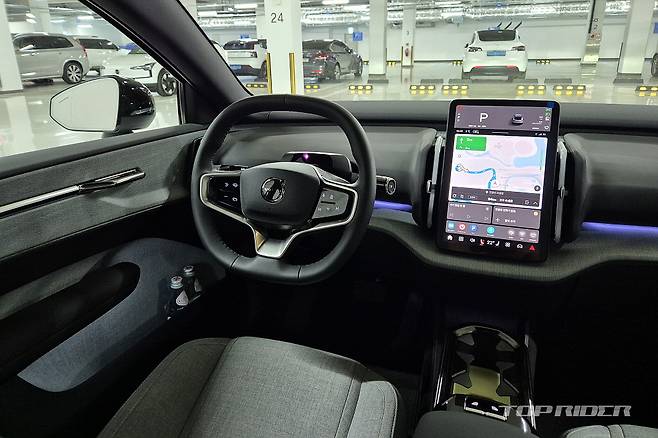 실내는 수평형 대시보드와 12.3인치 세로형 디스플레이, 그리고 윈드실드 하단의 사운드바를 통해 개방감이 강조됐다. 사이드미러 조절을 비롯한 대부분의 조작은 센터 디스플레이와 스티어링 휠의 방향키를 통해 가능하다. 가죽이 전무한 실내는 울(Wool)이 주는 고급감이 인상적이다.