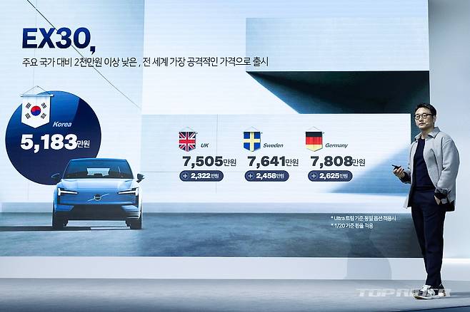 볼보코리아는 EX30의 가격을 EX30 코어 4755만원, EX30 울트라 5183만원으로 책정했다.(세제혜택 후 가격) 사전계약시 대비 190~333만원 인하된 가격이다. 2025년 서울시 보조금 적용 후 예상가격은 EX30 코어 4475만원, EX30 울트라 4903만원이다. 2025년 한국내 판매목표는 3천대다.