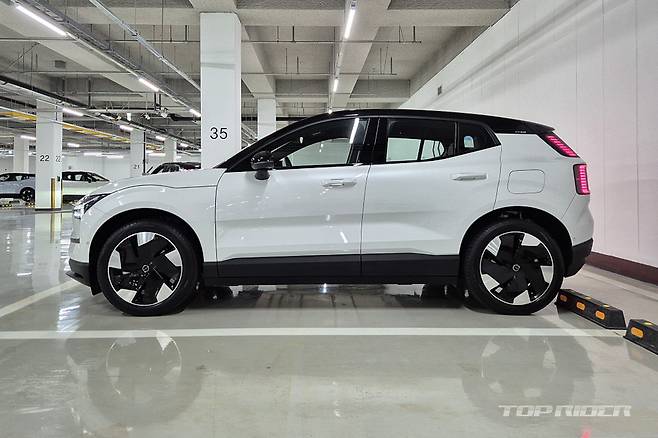 EX30의 전체적인 외관 디자인은 단단하면서 세련된 분위기다. 전장 4235mm, 전폭 1840mm, 전고 1555mm, 휠베이스 2650mm의 차체는 기아 EV3와 유사한 크기다. 지프 어벤저나 국내서 단종된 DS3 크로스백 E-텐스 대비 크고, BMW iX1이나 벤츠 EQA 보다는 작은 차체를 갖는다.