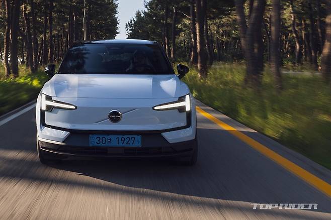 최고출력 272마력의 싱글 전기모터의 가속감은 경쾌하다. 초반 가속부터 힘을 쏟아붓는 타입은 아니지만 가속을 지속하면 속도계가 빠르게 상승, 후륜으로 밀어주는 감각으로 최고속도까지의 도달은 너무나 쉽다. 여담이지만 EX30 듀얼 전기모터는 제원상 역대 볼보차 중 가장 빠르다.